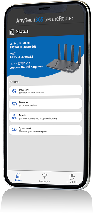 AnyTech365 SecureRouter krypterar all trafik som kommer från ditt hushålls- eller kontorsnätverk.