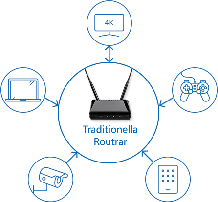 AnyTech365 SecureRouter är utrustad med Qualcomm Wi-Fi SON (Self-Organizing Network) mesh-teknik, vilket gör att du kan skapa ett mesh-nätverk i ditt hem och eliminera Wi-Fi-dödzoner. Mesh-teknologin gör att flera routrar kan kommunicera med varandra samt AnyTech365 SecureRouter, vilket skapar ett sömlöst Wi-Fi-nätverk som täcker hela ditt hem.